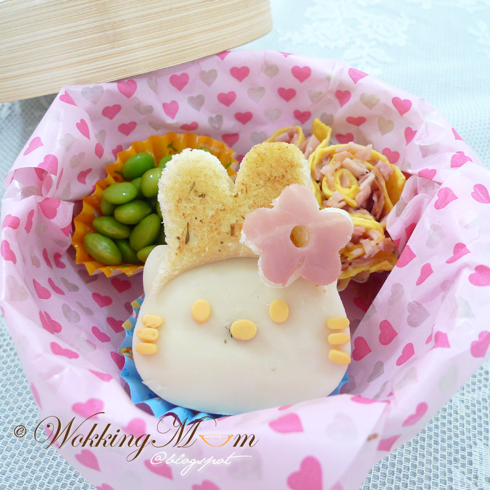 The 'Hello Kitty' was ham sandwich with cheese as the 'face'. The My Melody's ears hood (2 pieces) were lightly pan toasted with garlic spread. The flower was a piece of ham resting on bread. Before I pack it, I pinned all the parts down with spaghetti.