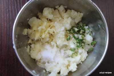 - Peel the cooked potato and mash it well using ladle or with your hands. Add chopped green chillies, ginger and salt.