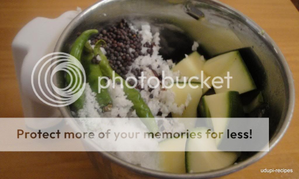- Chop mango in to medium sized pieces. Grind mango pieces, mustard seeds, green chillies, grated coconut and salt coarsely adding minimum water.